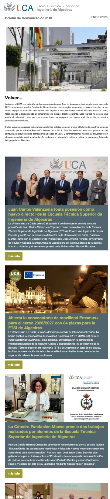 El del Boletín de Comunicación de la ETSI de Algeciras es una iniciativa del equipo de Dirección del centro que está pensada para mejorar la comunicación interna, y favorecer que nos sintamos más unidos y conectados. A partir de ahora se enviará por e-mail a los usuarios registrados en el TAVIRA de nuestro centro (PDI, PAS y Alumnos). En este boletín presentaremos cada mes un resumen de las noticias más relevantes publicadas en nuestra Web durante el mes vencido, así como un avance de los próximos eventos y cualquier información relevante para la comunidad universitaria de nuestra Escuela.