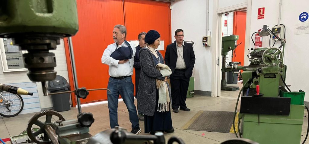 Diego Navarro y Nuria Baladés muestran los talleres de la ETSIA a la delegación de la UFU.